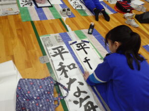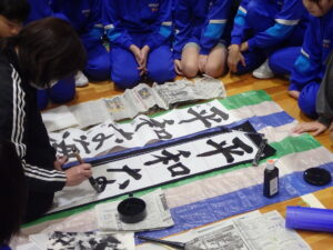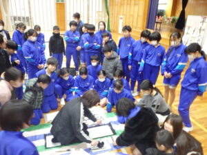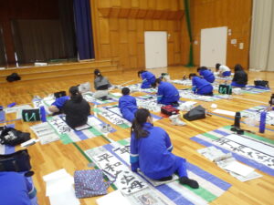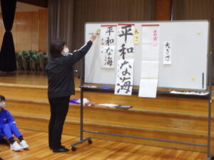 書初めの「特別教室」です。書家の上島芳子先生(町教育センター勤務)が指導に来てくださっています。本来は、体育館ですが、書初めが初めての3年生は、A組、B組ごとに教室で実施しました。