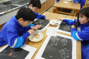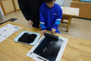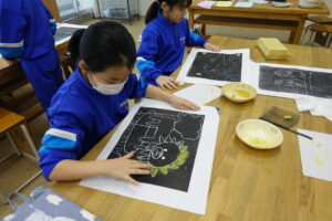 4年生。版画を刷り始めました。ゴム版ですので、彫刻刀の彫りも難しくなく、線彫りで終えました。線彫りですので、黒が多くなります。そこは、クレパスの色を粉にしてまぶし、刷るという技法のようです。少し色を入れるだけで、すごく映えるのです。どの程度、色を入れるか。その具合も、子供たちの作品を決めるポイントになりそうです。