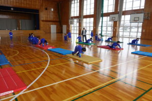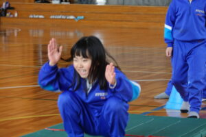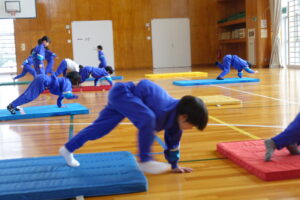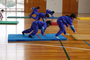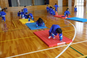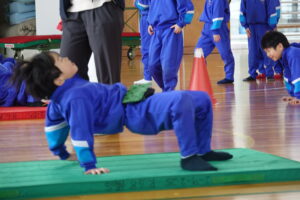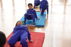 1年生の体育「マットあそび」を観ました。森田先生の指示に従って、その「歩き方」をします。「イヌ」「クマ」をちゃんと表現を変えて歩きます。四足歩行という歩き方も、なかなか難しいのですが、「おすし」というのもしっかり演じます。「くも」「ウサギ」と、楽しそうに取り組む表情を見ているだけで、こちらまで楽しくなります。なるほど。「マット遊び」をしながら、「表現あそび」の要素が含まれているのです。マットでいろんな体の動かし方をしながら、いつの間にか「表現」しているのです。