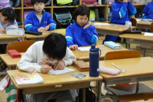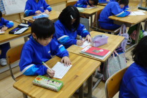 2年生が、「6年生への手紙」を書いています。「6年生を送る会」の2年生の出し物の一連の活動に含まれています。「うーん」と考えながら、書いた手紙をもって、國木先生のアドバイスを受けて、ブラッシュアップしていきます。生活とつながった「国語科」の学習となっています。