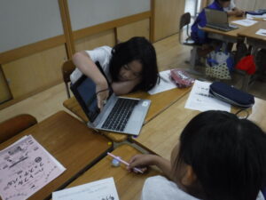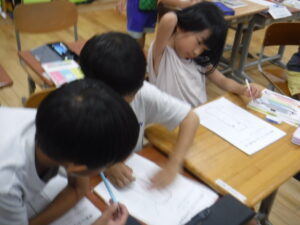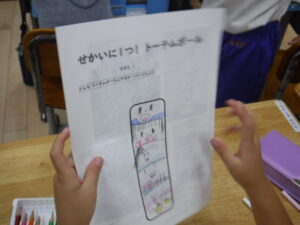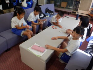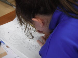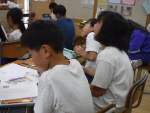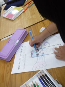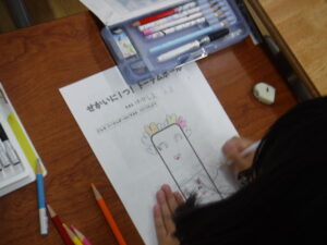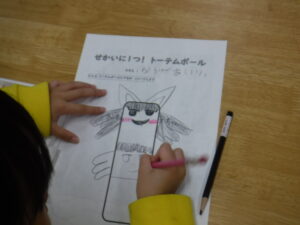 1年生は、「トーテムポール」のデザインを考えています。トーテムポールって、「まもり神」だそうです。自分のトーテムポールに何を守ってもらうのか「ねがい」が込めやすいですね。すらすら鉛筆が動きます。発想が豊かな1年生です。