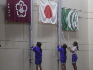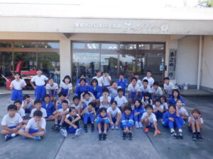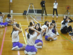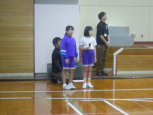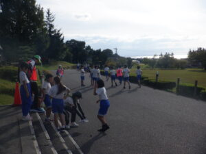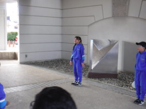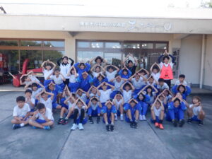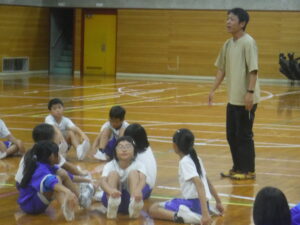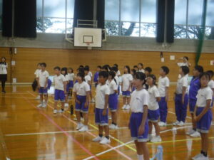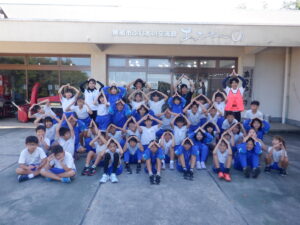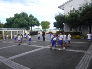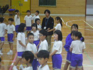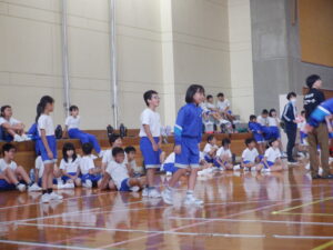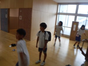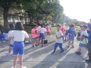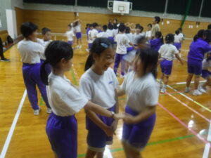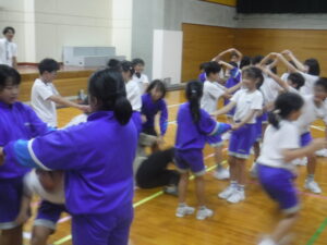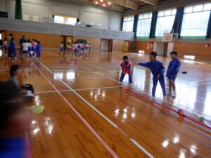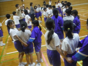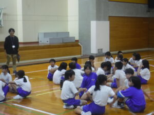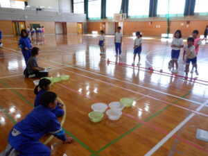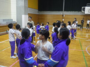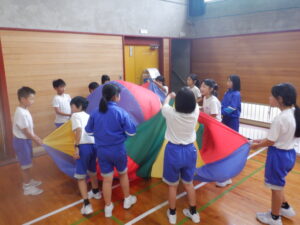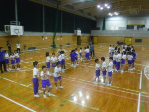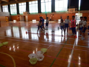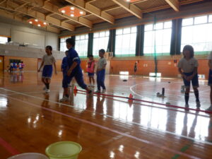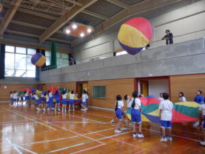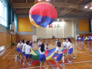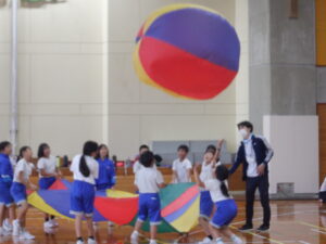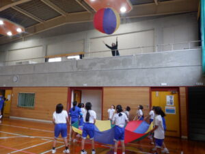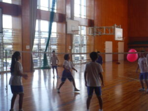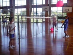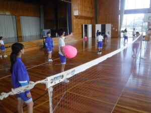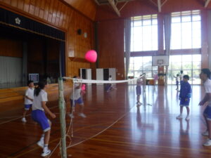 ワンバウンドふらば~るバレーは、おむすび型の軽い「ふらば~る」と呼ばれる変形ボールを使用し、ラリーの際にボールをワンバウンドさせてからレシーブするバレーボール型のニュースポーツです。6年生が取り組んでいますが、まずは、ビーチボールのようにノーバウンドでやっています。「ビーチとどっち難しい?」「こっち」という声が多いですね。ワンバウンドさせると、本当のおもしろさが見られそうですね。