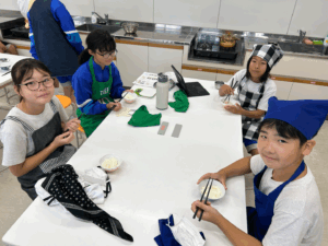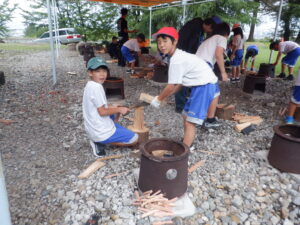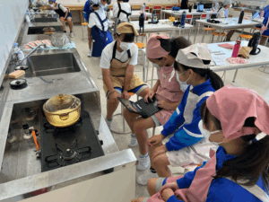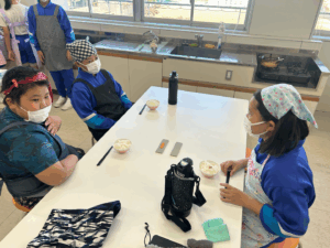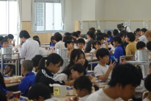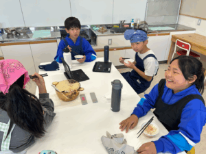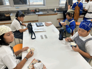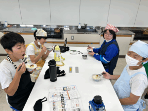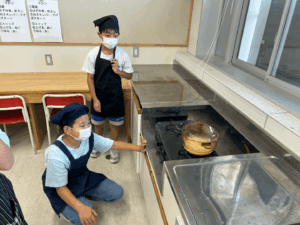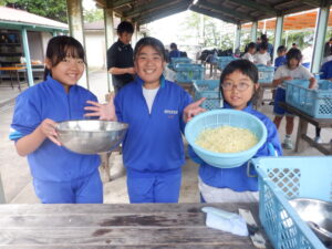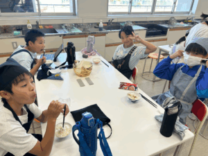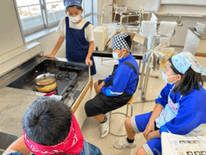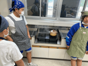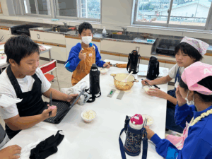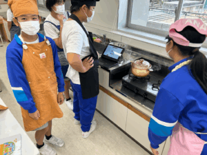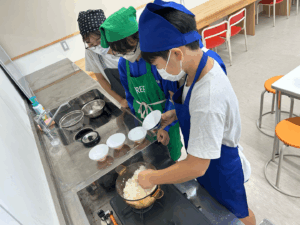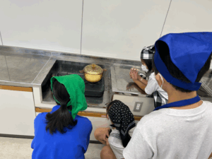 家庭科の調理実習。ご飯を炊いて、食べました。炊飯器ではなく、鍋で炊いたのと、透明なふたなので、「炊飯」のようすがよくわかったようです。