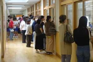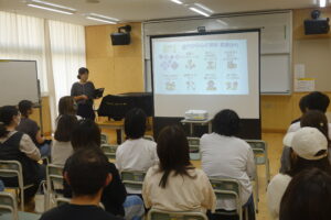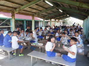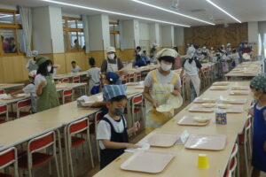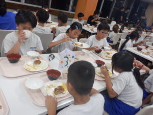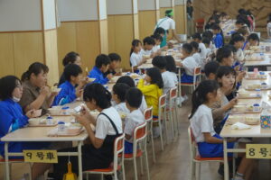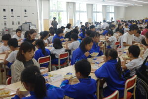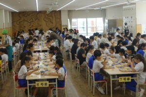 1年生が楽しみにしていました。「給食試食会」の日です。始めに、本校栄養教諭の伊藤先生から、「学校給食について」のお話がありました。給食室の調理の様子も説明され、調理員さんが衛生面、安全面に細心の注意を払われていることがよくわかりました。そして、給食の準備の様子を窓からご覧いただき、そして1年生の子供たちの前の席で、給食を試食していただきました。この後、1年生は親子学年活動があります。
