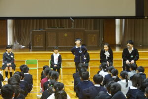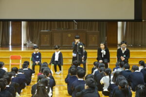 2学期の終業式では、1年 島おとはさん、2年 永原とむさん、3年 鍋谷さなさん、4年 上田あきとさん、5年 佐田るいさん、6年 籠瀬しゅうじさんが発表してくれました。それぞれ、すてきなメッセージが伝わりました。ありがとうございます。3学期の始業式には、また6人が話をしてくれます。