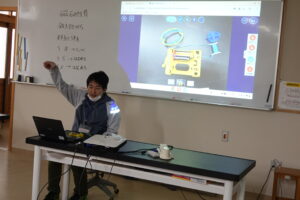 4年B組の外国語活動。ナディア先生が、アメリカの学校を案内してくれます。その中で、Kahoot!を使った「Yes,No」のクイズに答えていきます。