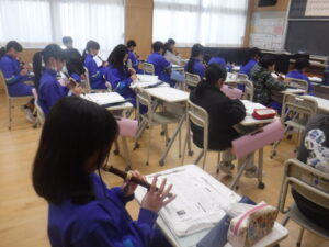 6年生の理科は、水溶液の分類(酸性・中性・アルカリ性) の学習。様々な水溶液(食塩水、炭酸水、石灰水、塩酸、アンモニア水など)を対象に、それらの性質を調べ、分類します。水溶液を蒸発させて、何か残るかどうか、においはあるかないかで、水溶液が何かを見つけていきます。山本先生から、実験の手際が良くなってきたと褒められる6年生。理科もそろそろ終わりが近づいてきました。6年間で、一番、科学的な学習に取り組んでいます。