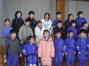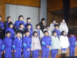 「6年生を送る会」の2年生の合唱。四杉先生のピアノよりも、速くなってしまいます。大きな声が出る分、伴奏が聞こえなくなってしまうようです。プレゼント渡しの動きまで、できています。順調ですね。