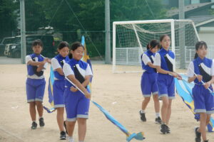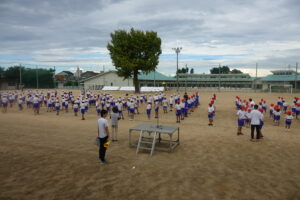 曇り空。1時間目に初めての全体練習を実施しました。開会式の練習です。帽子のかぶり方、並ぶ間隔、お礼の仕方等の基本練習を始めて行いました。短時間で、できるようになっていきました。1年生を含めて、これだけの人数で揃うようになるのは難しいと思ったのですが、なかなかたいしたものです。こういう機会にできるようになっていくこともたくさんありますね。練習後に、みんなで石を拾いました。少しずつ準備が進んでいきます。