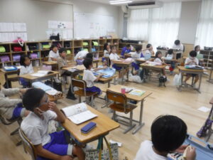 運動会が終わって、ようやく「150周年記念事業」への頭の切り替えができました。各学年の学習発表の準備に入ります。5年生は、他の学年の発表を見ながら、5年生ならではの発表について話し合っています。さあスタートです。