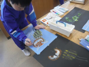 5年生の図工。版画は、一版での多色刷りです。彫る量は少ないのですが、色付けをして何度もバレンでこすっていきます。色の使い方がよく考えられています。5年生最後の作品がもうすぐ仕上がりそうです。