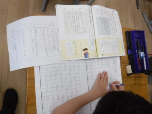 2年生A組。真剣な様子で原稿用紙に向かっています。これまでの自分のメモやタブレットの画像を見ながら、そして教科書の「例文」を確認する姿も。もう、これでの「文章」を書く段階なんですね。新庁舎を見学したこと、家の裏で蛍を見たこと。そんな見つけたことをゆっくりと文章にしています。大事な時間です。