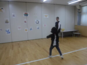 1年生の体育。全校、「持久走」に取り組み始めています。グラウンドは1周が長いこともあって、体育館で「1周走」をグループ順に何回かやりました。「わたし、心臓とまりそう」という子も「心臓がバクバクしているってことだね」。森田先生も「心臓バクバクするまで走っているのすごい」と声がかります・「まだ、走りたい人?」何回も出てくるんです。すごい、やる気でした。