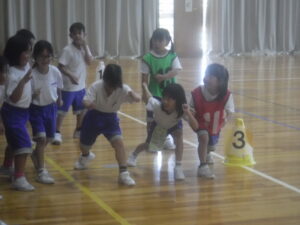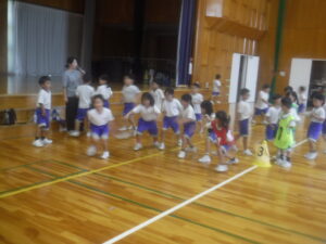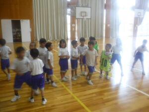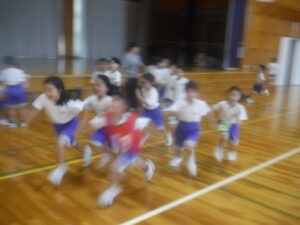 1年生の体育。全校、「持久走」に取り組み始めています。グラウンドは1周が長いこともあって、体育館で「1周走」をグループ順に何回かやりました。「わたし、心臓とまりそう」という子も「心臓がバクバクしているってことだね」。森田先生も「心臓バクバクするまで走っているのすごい」と声がかります・「まだ、走りたい人?」何回も出てくるんです。すごい、やる気でした。
