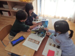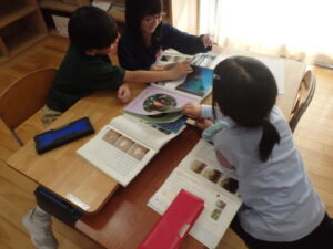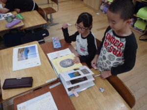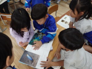 1年生の「こくご」。「うみのかくれんぼ」の学習を終えて、「うみのいきもの図鑑づくり」に取り組んでいます。深海魚博士もいて、なかなか高度な図鑑もできそうですよ。
