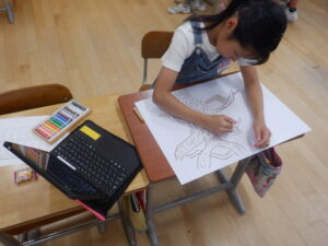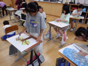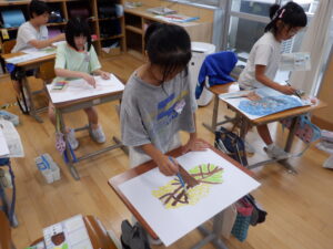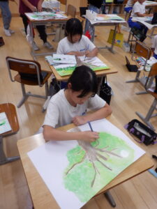 4年生は、宿泊学習もあって、少し休んでいた図工の「木々をみつめて」が始まりました。ついに、色をのせ始めました。葉の色を濃く塗らないように意識し、薄く塗っています。