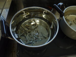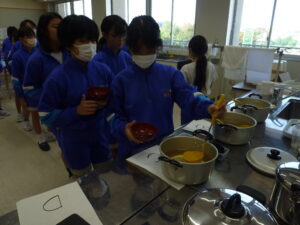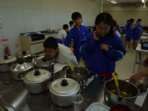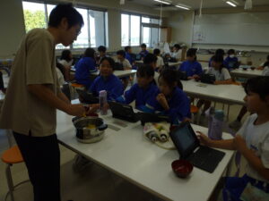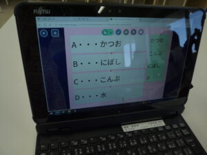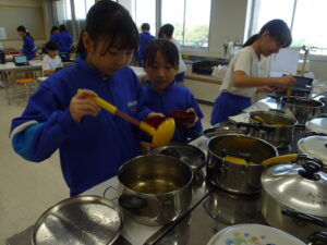 5年生の家庭科です。「だし」の飲み比べをしました。「かつお、にぼし、こんぶ、水」を飲む比べて、当ててみました。日頃は、「ほんだし」のような「だし」が多いと思うのですが、日本の料理の奥深さの一端を感じられたようです。