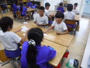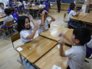 3年生の外国顔活動は、いつもにぎやかです。まずはアルファベットに親しむことがねらいですので、カードでたっぷり遊んでいます。
