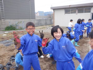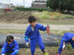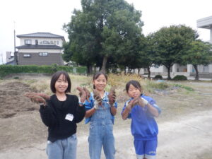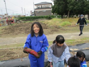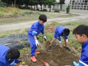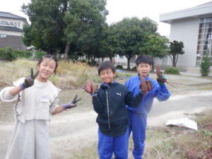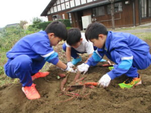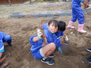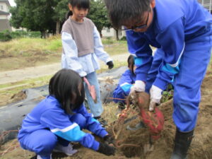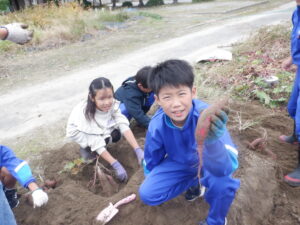 4年生がサツマイモの収穫をしました。大きなものもあって、折らないように一生懸命に土を掘っていました。なかなかの豊作でした。