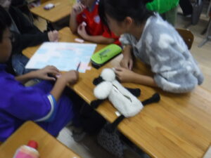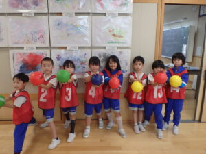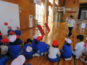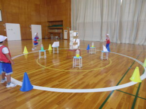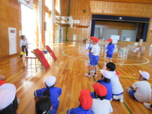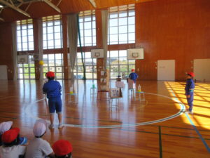 1年生の体育も2年生と同じく「ドーナツボール」です。「投げる」技能を小さいうちから身に付けることを意図しています。2年生と違って、「1年生は守りの人はなし」で単元を構想していました。しかし、「もっとむずかしくしたい」という1年生の願いもあり、2年生と同じく守備をすることにしました。ゲームの動きが変わってきます。「もっとおもりを重くして、点数がとれにくくすればいい」と、自分たちで「よりおもしろいゲーム」にしようとしています。どんなルールだと、「おもしろく」、「ほどよく難しくなる」かを考えています。