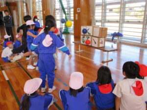 2年生の体育科「ドーナツボール」の2時間目です。今日は、練習時間でもある「パワーアップタイム」のメニューが紹介され、「パワーアップタイム」をやってみました。