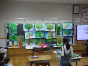 4年生の図画「木々を見つめて」が完成しましたね。それぞれの味のあるイチョウの木がそろいました。