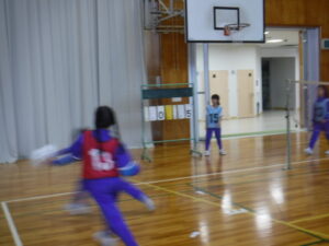 5年A組の体育は、「クラッシュボール」。昨年、開発された教材ですが、「投げる」運動であり、パス回しもおもしろく、人気の教材となっています。子供たちにも「面白い!」と評判です。ボールの大きさや的となる箱のサイズまで、やはり、うまく考えられています。