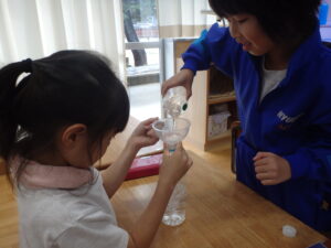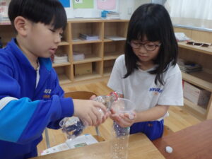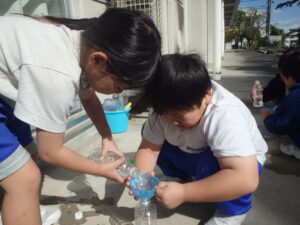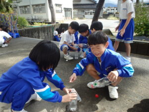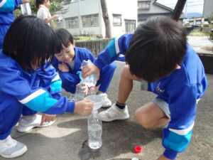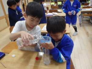 1年生の算数科「どちらがおおい?」です。2つのペットボトルの「どちらがたくさん水がはいるか?」を予想し、確かめます。子供たちは、「高さの高い」入れ物が、「たくさん入る」と予想します。しかし、このペットボトル。高さは低いけど、太いものが森田先生によって用意されているのです。同じ「なっちゃんペットボトル」でも高さが違うのですが、そうです。水を入れてみれば、わかりますよね。次回は、3つの入れ物の「どちらがおおい?」だそうです。量感覚を体感しています。
