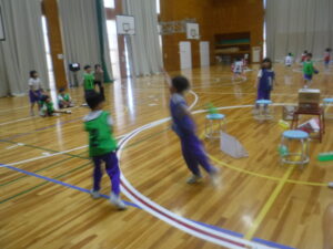 2年生の体育科「ドーナツボール」。投げたち、受けたりする技能も大切です。今回、昨年度できた「てつぼうゾーン」を半分にして、「まとあてひろば」になっています。休み時間等に使っています。大成君が、四杉先生と練習していました。今日の課題は、「受けてから、すぐ投げる」でした。あまりボールを投げられなかった子たちも、けっこう強く投げられるようになってきています。