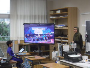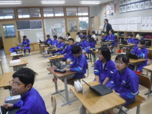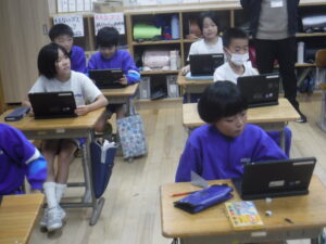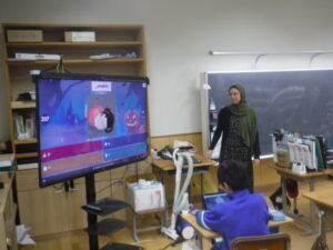 3年生の「外国語活動」。廣田先生とナディア先生です。早押し4択クイズのKahoot!を利用しての「英語クイズ」。今回は、ハロウィンバージョンでした。
