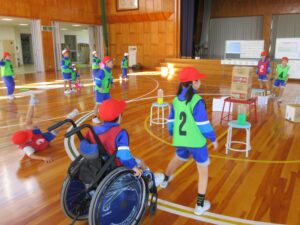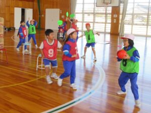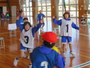 1年生も2年生も「ボールを投げる」「ボールを受ける」技能の向上を狙って考案された単元。1年生は、ボールが1個なので、特に「投げる」運動をたくさんできればいいなと思います。