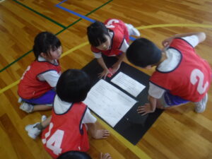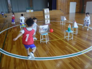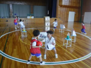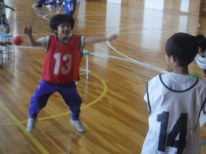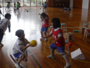 1年生も2年生も「ボールを投げる」「ボールを受ける」技能の向上を狙って考案された単元。1年生は、ボールが1個なので、特に「投げる」運動をたくさんできればいいなと思います。