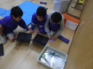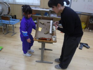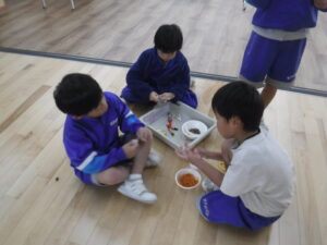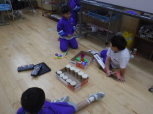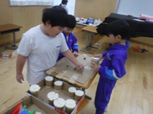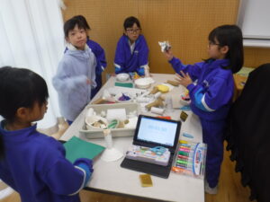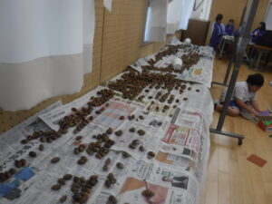 1年生は生活科で、「ドングリ」等を拾ってきてから、ドングリを使った「もおちゃづくり」に取り組んできました。今度は、これらを使って「おみせ」を開きます。今日は、お店のプレオープン。自分たちがお客さんになてみて、お店のおためしをしました。うまくいかないことの発見もあったようで、ここからブラッシュアップしていきます。だれを相手のお店にしていくのでしょう。