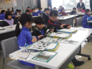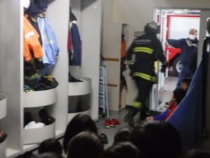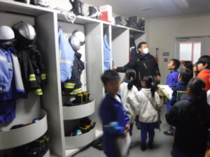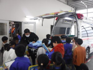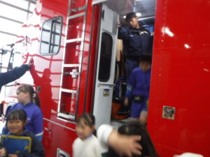 入善消防署では、たくさんの資料見せていただき、消防署内の施設、そして消防車、救急車の中まで見ることができました。