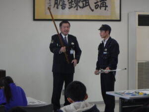 入善警察署では、たくさんのお話を聞かせていただきました。実際に手錠や警棒も見せていただいたり、警察官の方が来ておられるベストも触らせていただきました。