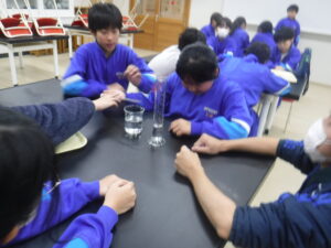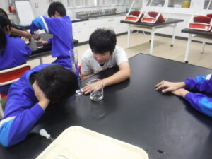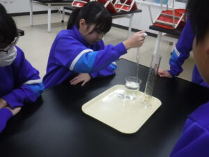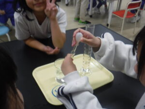 5年生理科。液体の体積を正確に測り取らないと、「実験の精度が低く」なります。上田先生、さすがに理科専門ですので、メスシリンダーでスポイトを使って、液体の体積を調整する「技能」面を取り上げ、しっかり押さえておられました。理科では、すぐに実験をしていることも多く、基礎的な実験技能が見についていないことがあるのです。基礎的な技能面に特化する時間も大切です。