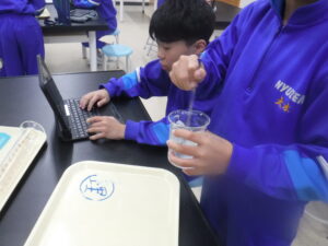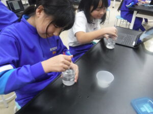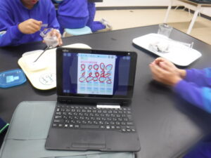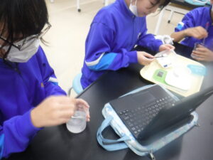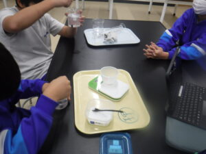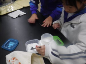 5年生の理科。「もののとけかた」の学習です。食塩とミョウバンのとけ方を比べています。今日は、まず、「食塩」をかき混ぜて溶かしています。子供たちは、「塩って、意外に溶けないなぁ」と思っています。砂糖がよく溶けるのを見た経験がある子は、不思議に思っています。じゃあ、もっと溶かすにはどうしたらいいでしょう?水温を上げていくと、溶けるのでしょうか?そんなことを考え出すと、本当に面白いのです。5年生の理科、だいぶ、科学的になってきました。