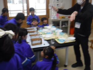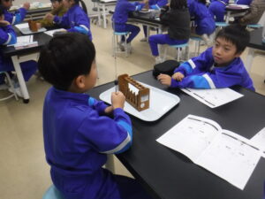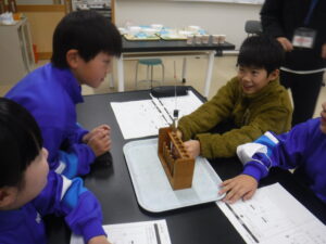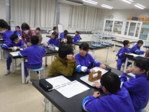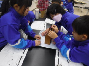 4年生のA組の理科。ものの温まり方の単元です。理科は、両組とも大越先生です。おもしろそうなところに入っていました。この頃から4年生の学習も科学的な内容になり、子供たちを惹きつけます。「試験管を握って温めると、試験管の水の体積はどうなるか?」という学習課題です。「えっ?温めると水の体積が増えるの?」「そんなわけない」といった感想をもちながら、ワクワク実験をしていました。空気、水、金属を温めるとどうなるかを考えていきます。