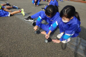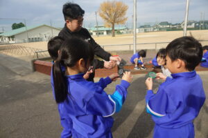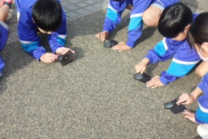 何をしているのだろうと見ていますと、3年生が理科で光を集めています。12月2日に、この学習をするとは、やりますね。しかし、今日は太陽が出てくれたのです。午前中は、光を集めて火が出たようですが、午後はつかなかったようです。やはり、この季節の日光は弱いということも実感できたし、この季節の日光でも「強さ」があることも、また感じられました。間違いなく、1か月前にほうが向いている教材です。3年生は、とても集中して、楽しんでいました。