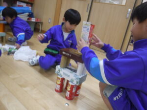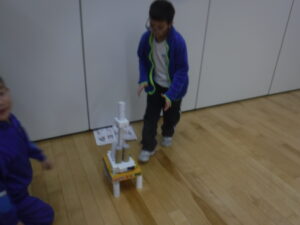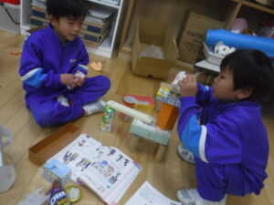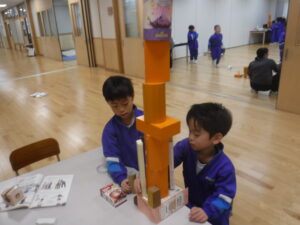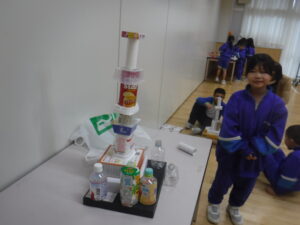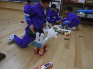 かたちあそび(1年)【12.4】 生活科かと思ったら、なんと算数でした。1年生の算数「かたちあそび」です。1年生は、本当に夢中になって、創造力豊かにかたちを作っています。これが、算数なんて、面白いですよね。