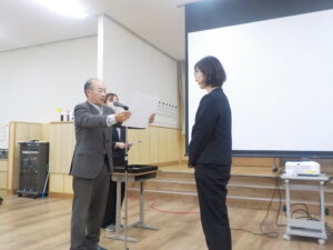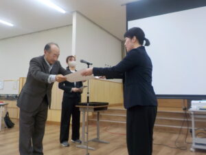 入善小学校の後援会である「自卑同窓会」の第2回全体役員会が、4日(木)にランチルームで行われました。会に先立ち、本校10年勤続表彰として、村井養護教諭、森田教諭が、田原会長より感謝状と記念品を授与されました。自卑同窓会の会計経過、事業経過については、1回目の役員会でのご意見を受け、大きく見直した点について確認をしていただきました。地域の皆様から、たくさんのご援助をいただいていることに心より感謝申し上げます。