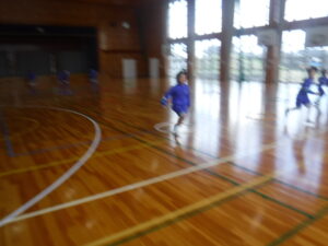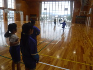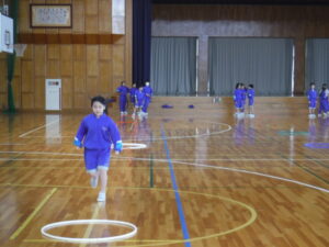 3年生は両組とも、小型ハードル走に取り組んでいます。中学年の「小型ハードル走」では、小型ハードルを調子よく(動きがとぎれずに滑らかに)走り越える心地よさや、友達と競い合う楽しさや喜びに触れます。フラフープを入れ、リズムが変わるコースを体をたくみに操作しながら走り越える動きも身に付けます。A組は、連続でリレーを続け、持久的な運動も取り入れています。