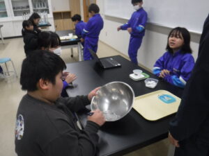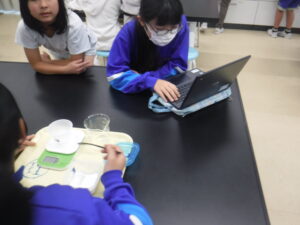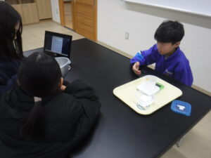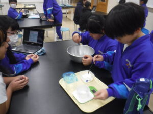 ボールに水を入れ、はかり取った「食塩」を入れ、混ぜながら溶かしていきます。見ていると、砂糖と違って、食塩はなかなか溶けません。地道に混ぜて溶かそうとしています。「塩って、なかなか溶けないんだな」という実際にやった感覚が残るといいですね。「食塩が溶けたってどうしてわかるの?」と聞いてみました。「粒が見えなくなったら」と即答でした。よくわかっていますね。