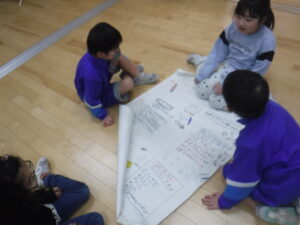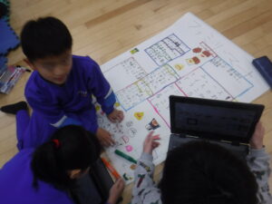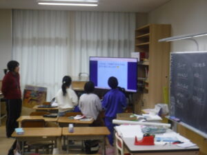 2年生、生活科「まちたんけん」のまとめをしています。模造紙に多く書いているグループ。タブレットでプレゼンをつくっているグループ。それぞれのグループで活動を進められるのが、2年生のすごいところです。発表の練習も始めています。活動をして、話し合いをして、まとめて、発表するスタイルが定着しています。言うことは簡単ですが、これを低学年にできるようにするのは、難しいことです。