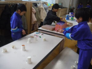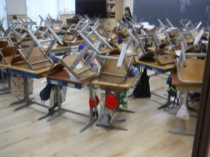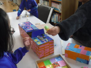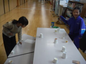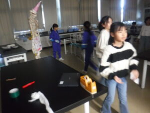 今日は「お楽しみ会」の教室が多いようです。1時間目は、2年生。4部屋を使って、大々的です。教室は椅子が上がっています。なるほど、「めいろ」だそうです。理科室は、まさかの「お化け屋敷」でした。廊下では、まさかの「カラオケコーナー」がありました。2年生、考えること、やることが面白いのです。