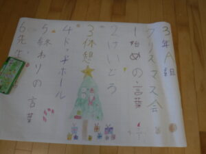 3年A組が、「クリスマス会」でした。内容は、「けいどろ」と「ドッチボール」のスポーツ系ですね。ドッチボールは、ボールを片手で投げられない子も女子には多いようです。これは興味深い。今年の1,2年生は、体育で「まとあてゲーム」「ドーナツボール」に取り組んだので、かなり投げられるようになりました。体育の授業の効果をあらためて感じました。3年生は3学期で、どれくらい投げられる(受けられる)ようになるでしょうか。