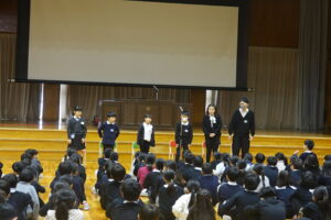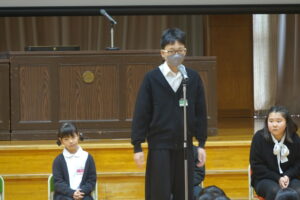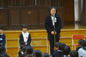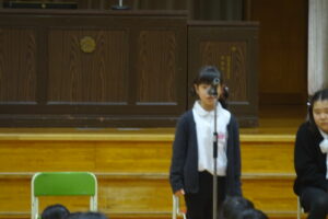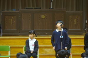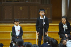 2学期の終業式では、1年 島おとはさん、2年 永原とむさん、3年 鍋谷さなさん、4年 上田あきとさん、5年 佐田るいさん、6年 籠瀬しゅうじさんが発表してくれました。それぞれ、すてきなメッセージが伝わりました。ありがとうございます。3学期の始業式には、また6人が話をしてくれます。