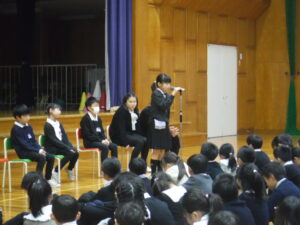 始業式、終業式の中心は、「各学年代表の子供たちの発表」です。私たちも楽しみにしています。280名ほどの前で話す機会は、とても大きな経験です。そして、「2学期、こんなことあったよ。実は、こんなこと頑張ったよ」という話をしてくれるのは、全校がみんな「2学期をふりかえる」機会になります。
