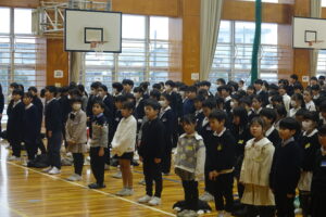 3学期の始業式でした。校長からは、はじめて「合理的配慮」について話しました。みんな、同じではないので、困っている人には手を貸してほしいし、「手伝って」と言えるのが、学校です。短い3学期、これまでやってきた力が、ぐーんと伸びる時期です。3学期も「笑顔でいこう!(笑顔が難しい)」「目標に本気で取り組む」「レベルアップ!授業でしっかりと活躍する」の3つをあげました。「令和8年」「2026年」「丙午」は、みんなよく知っているので、感心しました。卒業式まで67日、3学期は75日しか、ありません。短い学期ですが、いっそうの子供たちの成長を願い、期待しています。