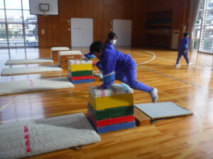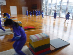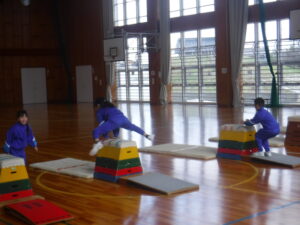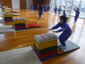 3年A組の体育。昨年は、「とび箱あそび」として取り組んでいましたが、3年生からは「とび箱運動」。ですから、技の習得を目指しています。浜岡先生が、「開脚とび」を丁寧に指導し、練習しました。この日初めて、4段をとべた子が出ました。直前まで、どうしても飛び越せずに、涙が出ていたのですが、もちろん、とびっきりの笑顔になりました。こういう瞬間に出会えるのが、私たちの大きな喜びです。この子たち、先生の説明をとても真剣に聴くのです。なるほど、上達していくはずですね。